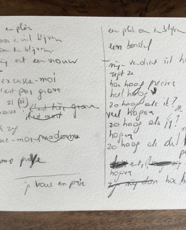 Charlotte van den Broeck schreef zelf in Parijs twee lange gedichten: de reeks Snede en het lange gedicht Dorst. Voor dit laatste gedicht vond ze de inspiratie in het Hôtel des Belges, een bevreemdende kroeg in de Franse hoofdstad waar ze op aanraden van David Van Reybrouck mee naartoe ging.