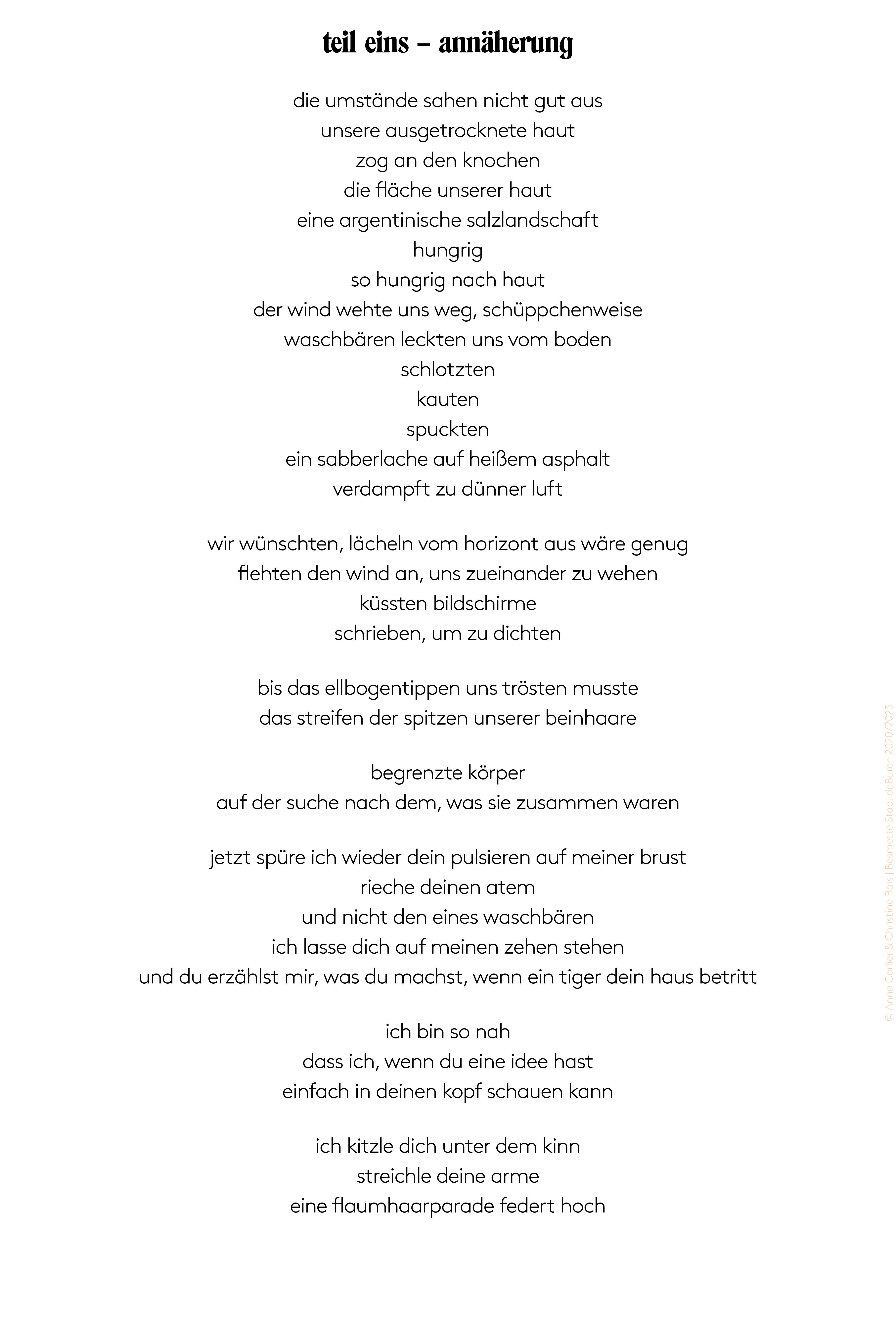 Anna Carlier (Gent) schrijft, maakt en speelt. Ze creëert het liefst imaginaire werelden die aanvoelen als nieuwe werkelijkheden. Ze beeldhouwt die werelden nauwkeurig met taal en schuwt geen absurdisme. Ze presenteert haar werk met haar gezelschap Compagnie de Kolifokkers. Haar blog met gedichten heet Andermans Gedichtengoed.