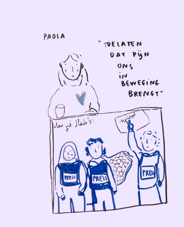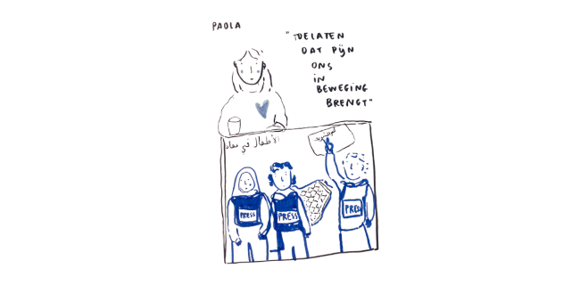 Toen ik werd gevraagd om een tekst te schrijven over ‘moed’, zag ik dit beeld voor me. Mijn eerste, onmiddellijke gedachte was: ik wil de moed van de Palestijnse journalisten belichten. Maar mijn tweede gedachte was: wat levert het de journalisten eigenlijk op als ik hun moed loof? Als ik hen helden noem? Wat hebben zij hier aan, wetende dat vele van hen werden vermoord omwille van hun werk? En wetende dat dit, ondanks een officieel staakt-het-vuren, nog steeds blijft gebeuren?