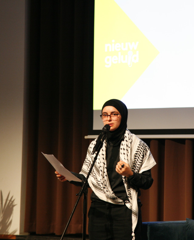 Sakina El Kaddouri schrijft gedichten en slam poetry. Haar teksten zijn maatschappelijk bewogen, en zoeken de spanning op tussen persoonlijke verantwoordelijkheid en dat van het collectief. Tijdens Nieuw Geluid Live was ze niet enkel gastvrouw, maar sloot ze de avond ook af met een stuk slam poetry.