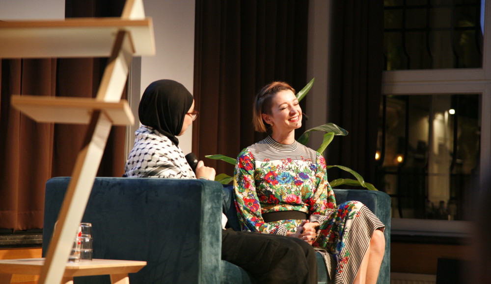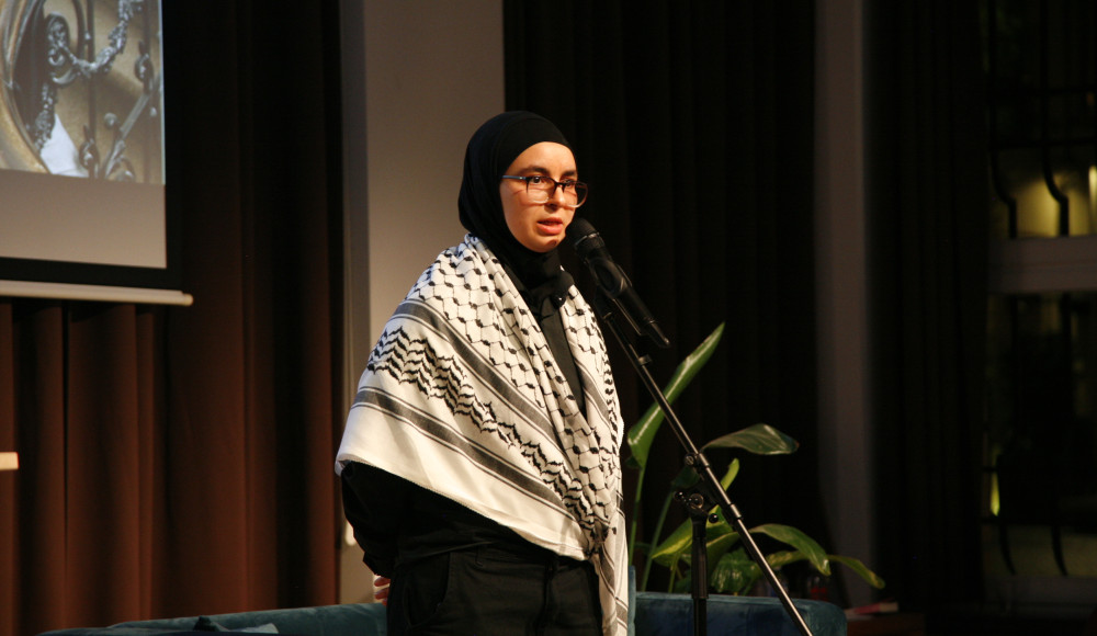 Host Sakina El Kaddouri stond niet enkel op het podium als host, maar sloot het event ook af met slam poetry. In haar slam vraagt ze zcih af in welke hoeken de Palestijnen nog kunnen schuilen wanneer hun hele huis met de grond gelijk gemaakt wordt. Luister mee of lees het hier.