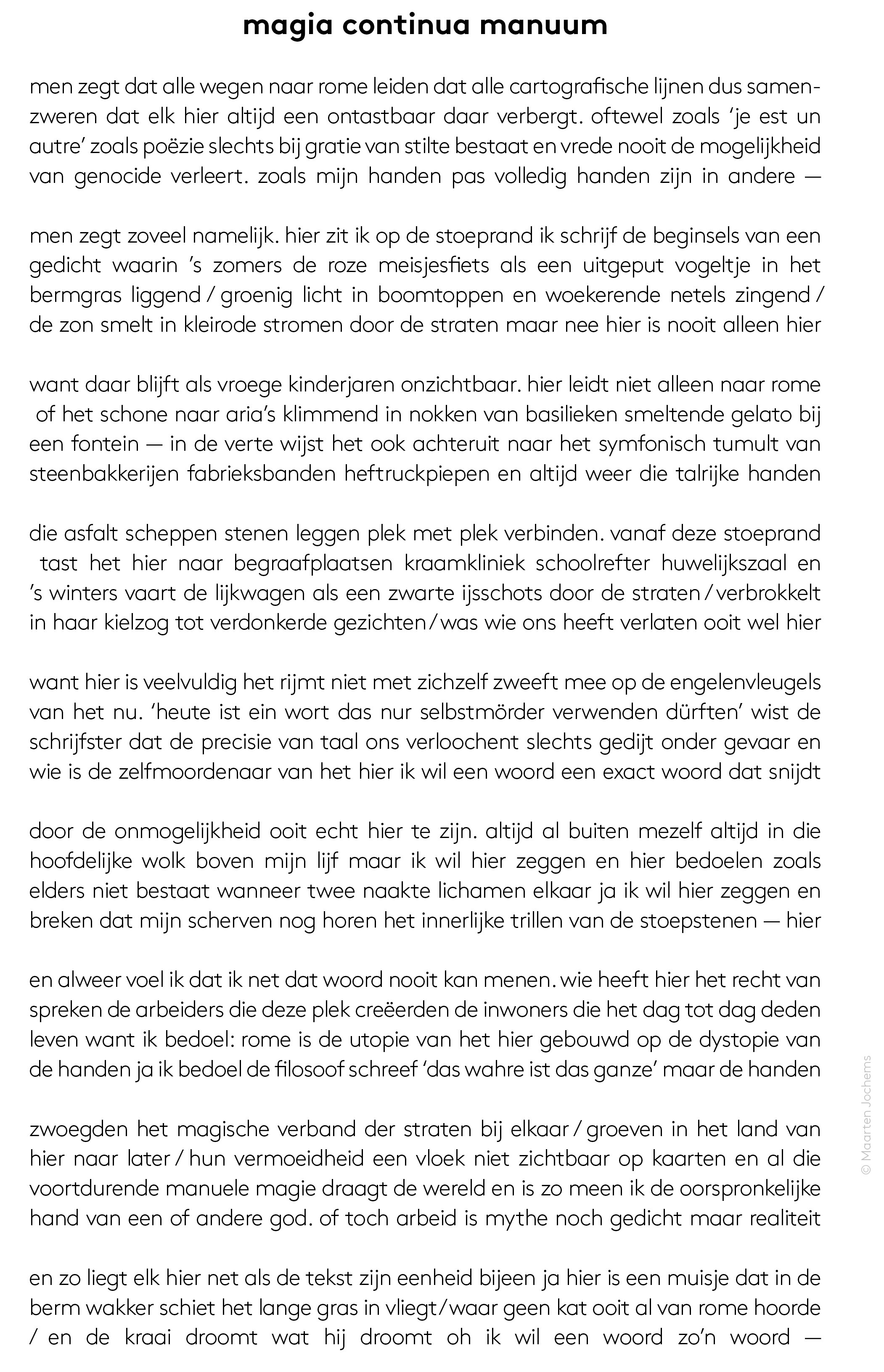 18 aanstormende auteurs uit de Lage Landen die in 2025 deelnamen aan de schrijfresidentie van deBuren omsingelen samen op literaire wijze Leeuwarden, de thuisbasis van Explore the North. Elke schrijfresident kreeg een coördinaat aan de rand van de Friese hoofdstad en blikt vandaaruit – in alle dimensies – de wereld in om een nieuwe tekst te schrijven met in het achterhoofd het thema U bevindt zich hier. Achttien coördinaten en achttien artistieke interpretaties. Maarten Jochems vond inspiratie in de betonstraatsteen die hij op zijn coördinaat aantrof. ‘arbeid is mythe noch gedicht maar realiteit’