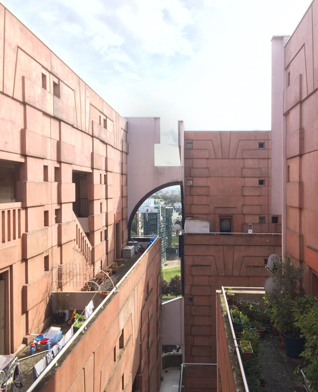 Maar ook de gevels met hun spel van verwijzingen zijn uitgesproken theatraal. Zo’n complexe vormentaal is geen vanzelfsprekendheid bij de lage budgetten van sociale woningbouw. Dat is een verdienste van de Taller de Arquitectura, die in de jaren zeventig uitvoerig experimenteerde met de mogelijkheden van geprefabriceerd beton. Alle bouwdelen konden in de fabriek gemaakt worden. Dit maakte een grote verscheidenheid aan elementen met een hoge betonkwaliteit mogelijk. Door het toevoegen van verschillende pigmenten bestaan de gevels uit allerlei schakeringen roze. Terughoudend, in het warme grijs van het exterieur, tot heel uitgesproken, in het hard oranjeroze van de binnenstraten in het paleis, die in combinatie met de planten die de galerijen sieren een mediterrane atmosfeer krijgen. De expressieve vormentaal van de gebouwen en hun gevels maken een machinale indruk. Het lijkt een complex apparaat waarin ieder onderdeel zijn eigen unieke functie heeft. Maar ook dit is theater, want achter al die gevels schuilt telkens hetzelfde: woning na woning na woning.