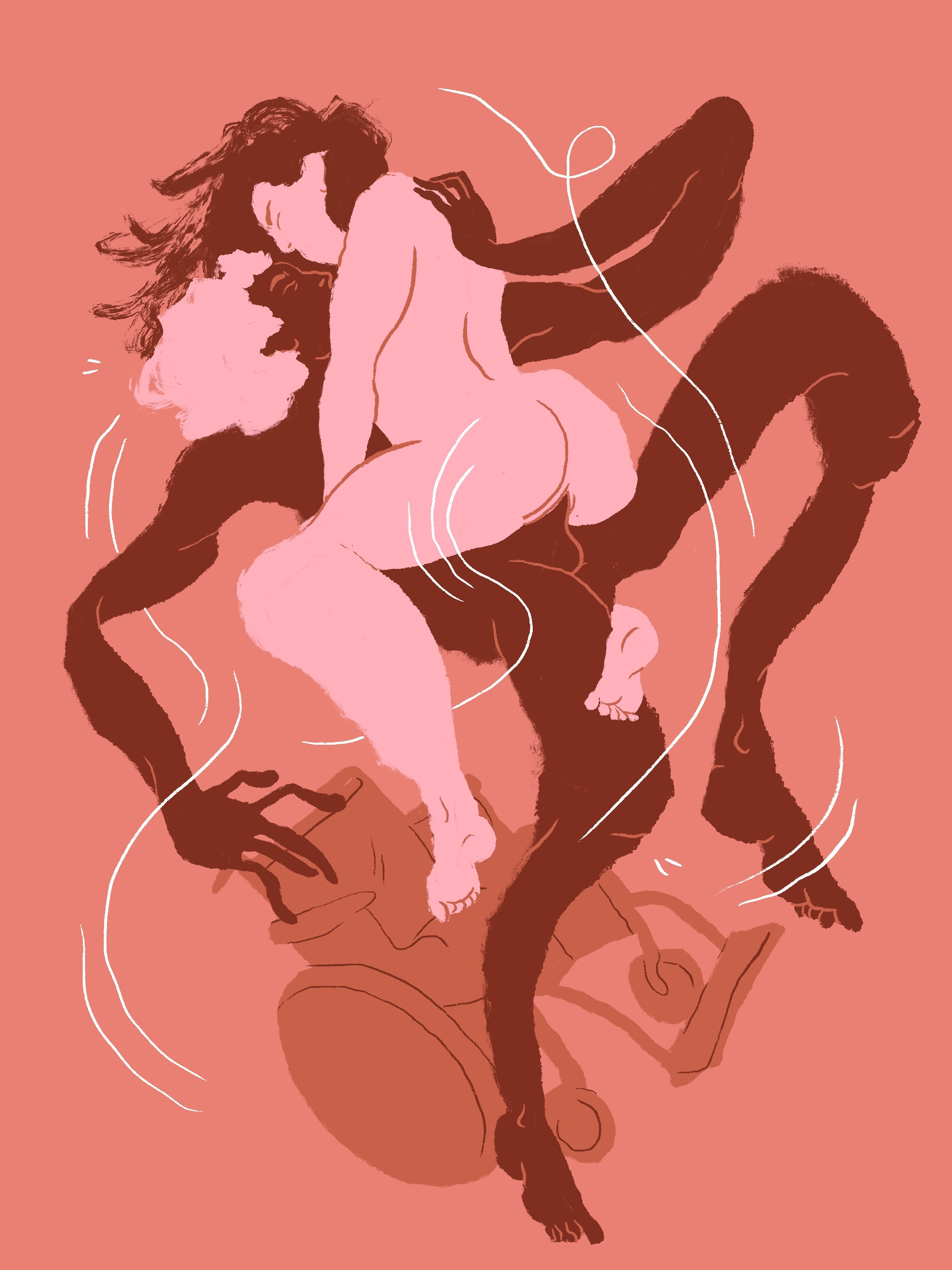 In gedachten span ik mijn spieren aan. Ik stapel de onderdelen op elkaar en bestier dit lijf. Even voel ik hoe het is om met gemak en vanzelfsprekendheid te bewegen. Een warme vloed verspreidt zich door mijn lichaam. Die verkent en vult de plekken die ik alleen niet eerder kon bereiken. Terwijl er zachte, kreunende geluiden klinken glij ik stilletjes naar een zeldzame en volledige ontspanning.