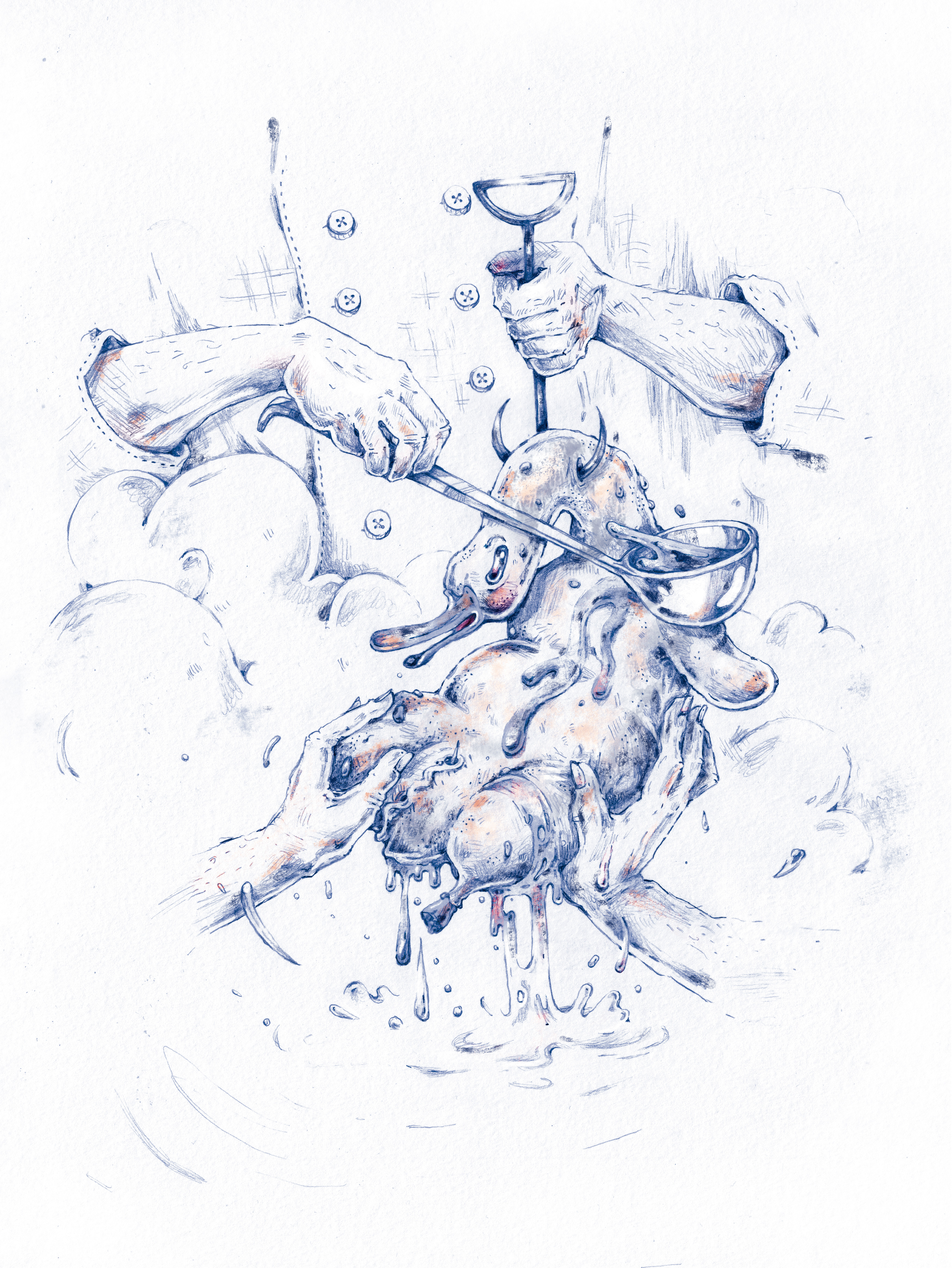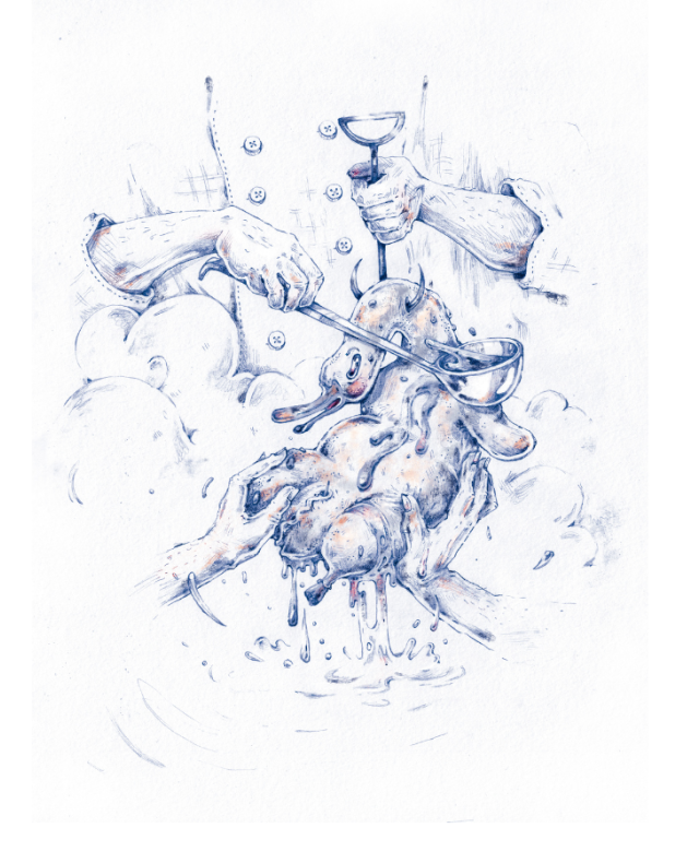 De manier waarop Sarah de haken die in de eend gestoken worden tekent, roept een combinatie op van ongemak en sensualiteit. Dit gevoel wordt nog meer versterkt door de druppels die langs het lichaam van de loensende eend lopen. Hiermee weet Sarah een dynamisch beeld neer te zetten en ons te voorzien van interessante beeldtaal.