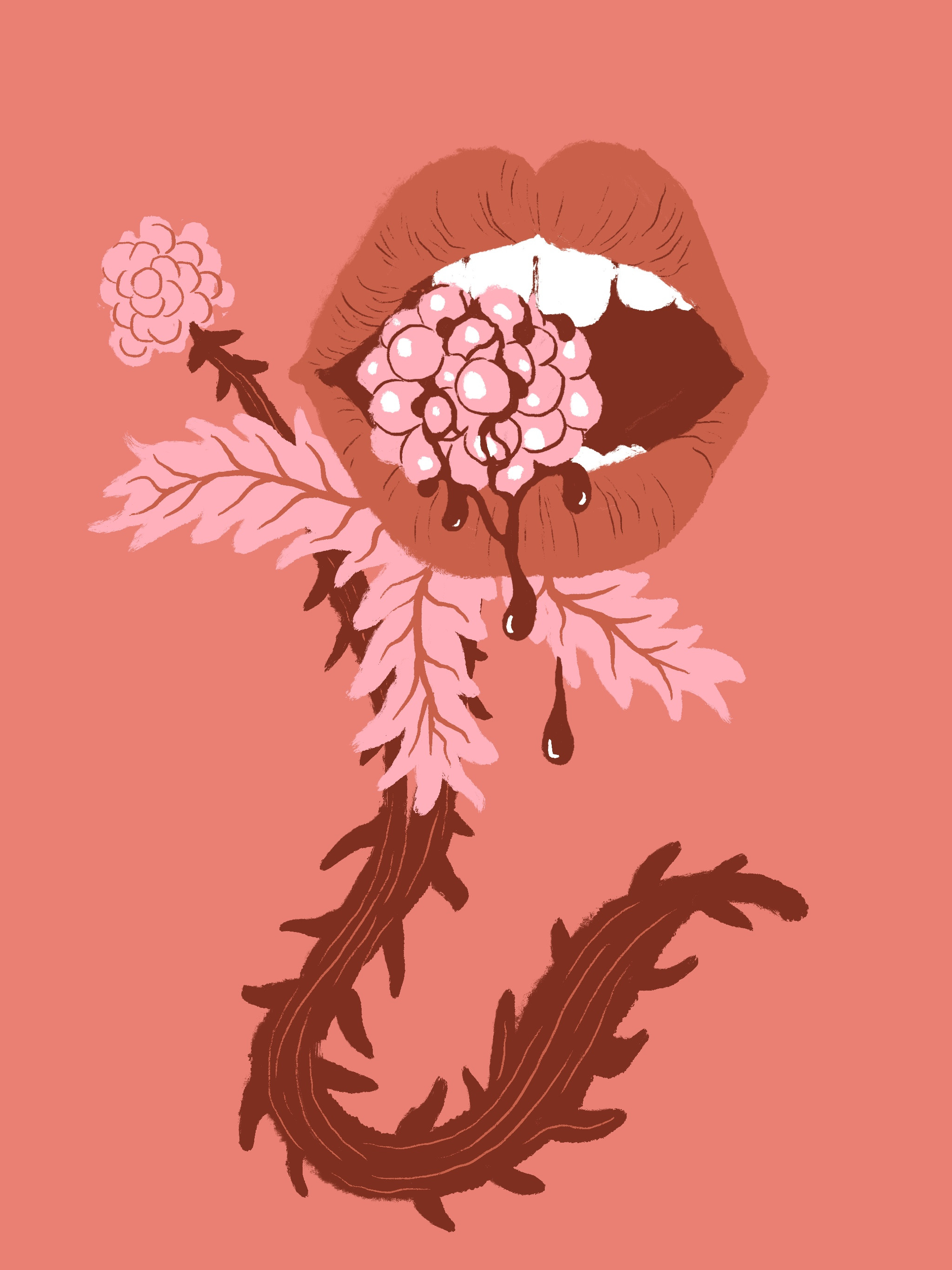 Ich sage, ich fühle es, meine Hand auf ihrem Bauch. Ich führe sie und strecke mich nach einem Strauch. Ich sage hier und dränge, iss.