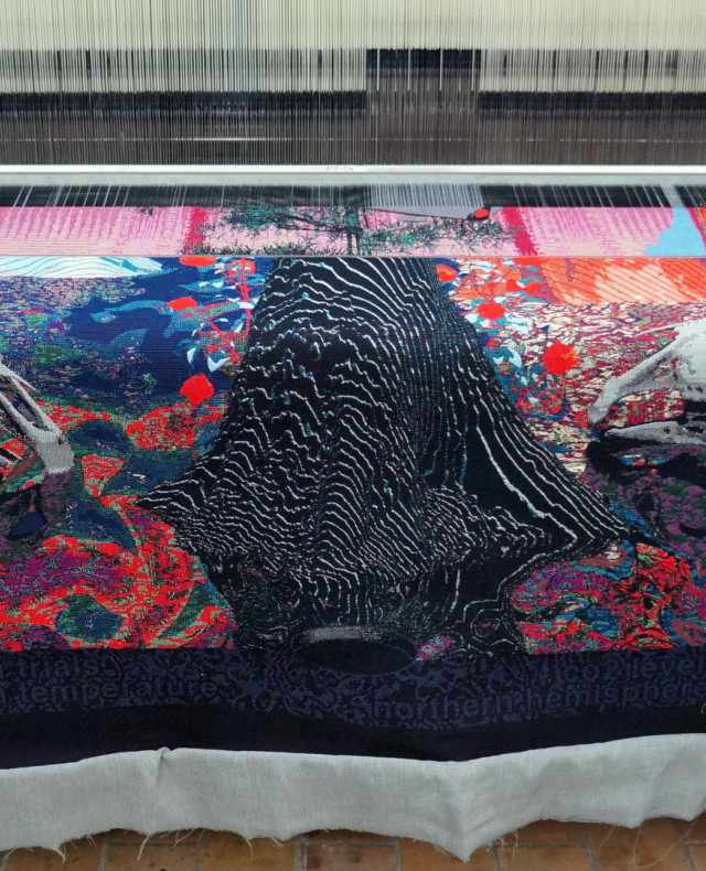 productie wandkleden Wildevrouw project, Jeroen Olyslaegers/Alexandra Crouwers in het Textiellab van het Textielmuseum Tilburg, augustus 2019 (foto: Alexandra Crouwers)