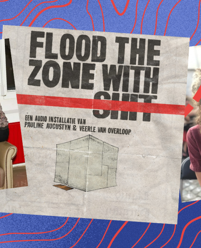 FLOOD THE ZONE WITH SHIT is een interactieve audio-installatie die uitnodigt to care. Als toeschouwer neem je letterlijk een plaats in binnen een kamer. Een kamer waar tussen muren van stof niemand meer is. Een kamer waar een echo nagalmt. Een seconde geleden was het er nog oorverdovend luid; een bombardement aan prikkels en informatie. De kamer komt zachtjes aan tot leven, ziet dat ze leeg is en probeert te begrijpen wat er gebeurt. Maar als we de kamer, de zone, niet willen laten overspoelen met shit, met wat dan wel? Wat is het weerwoord?