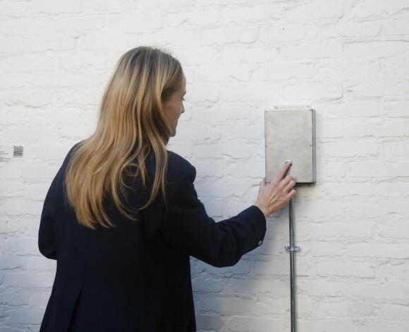 Naast de transmitter vind je ook een QR-code om te luisteren via je smartphone en waar je meer informatie kunt vinden over de kunstenaar en het werk.
